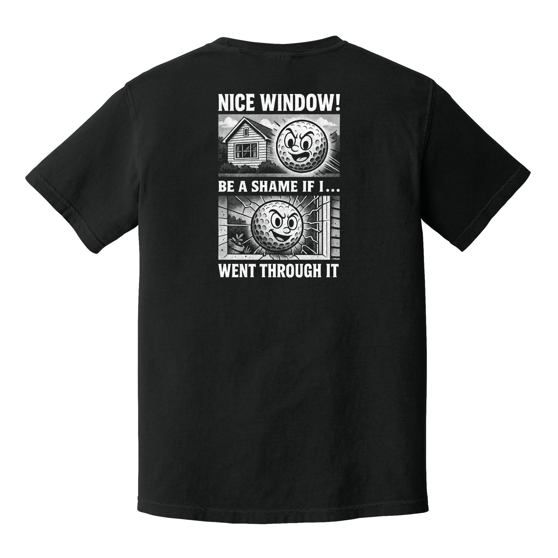 Mr. Dimple doesn’t miss fairways or opportunities for a little mischief. This tee is a black-and-white reminder that every window facing a tee box is one swing away from disaster.