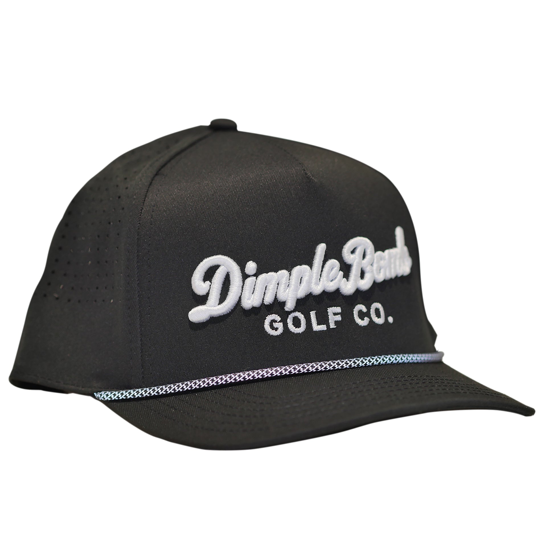 Our first hat drop, simple, sharp, and built to move. The Dimple Bomb logo stands bold up front in raised 3D puff embroidery, with Golf Co. stitched clean underneath. Lightweight polyester and laser-cut sides keep it breathable, while the quick-dry sweatband handles the heat. Finished with a rope accent and snapback closure for a perfect fit on or off the course.